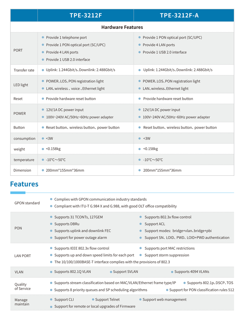 TPE-3212F/TPE-3212F-A is a GPON user terminal device. lt can communicate with mainstream OLT devices. Through high-speed GPON access services, users can be provided with broadband acoess services, The product provides four 10/100/1000M etrernet ports, featuring convenient and fexible networking applcations. simple and fast installationhigh reliability, and maintainability.